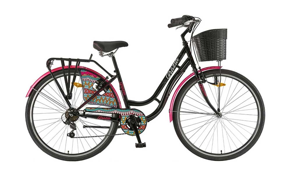 Grazia je opremljena mnogim korisnim dodacima koji značajno poboljšavaju udobnost bicikliranja. Košara sprijeda i nosač tereta straga pružaju brojne mogućnosti za siguran transport vaših stvari, što je vrlo zgodno i štoviše, košara jednostavno izgleda sjajno! Iznad kotača nalaze se blatobrani u boji koji štite biciklista od vode i prljavštine. Štitnik za suknju u uzorku modela. Tu je i rasvjeta koja jamči odgovarajuću vidljivost i sigurnost u vožnji po mraku.